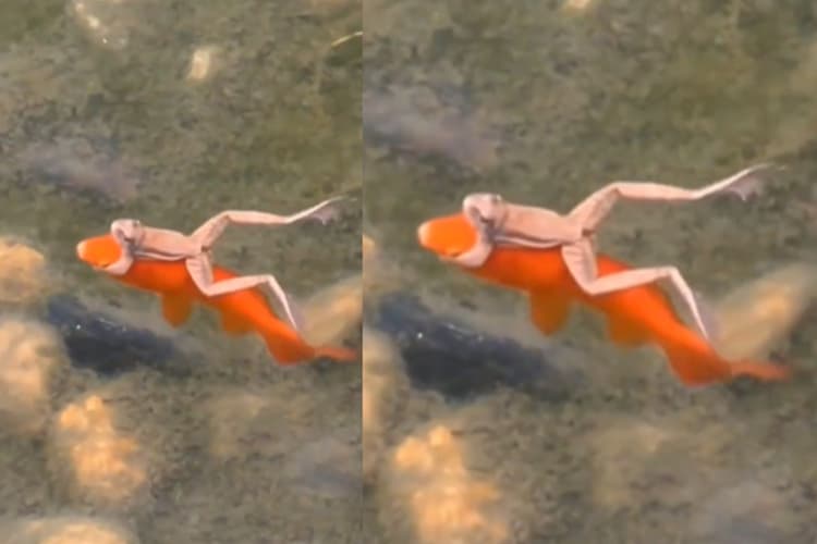 वीडियो में नजर आ रहा है कि एक छोटी सी गोल्डफिश पानी में तैर रही है, लेकिन वह अकेली नहीं है. उसकी पीठ पर एक मेंढक बैठा हुआ है. वीडियो में नजर आ रहा है कि मछली मेंढक को लेकर पानी में तैर रही है. वीडियो देखकर लग रहा है कि मछली को मेंढक को अपनी पीठ पर बैठाकर तैरने में मजा आ रहा है.