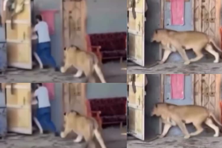 वीडियो में नजर आ रहा है कि शेर रिहायशी इलाके में चला आया है. वह दो लोगों के पीछे-पीछे तेज रफ्तार में दौड़ रहा है. वहीं लोग भी जान बचाने के लिए तेजी से दौड़ रहे हैं. वह दौड़ते-दौड़ते घर पहुंच जाते हैं. दोनों जल्दी से घर का दरवाजा खोलते हैं और घर में घुस जाते हैं. लेकिन जल्दबाजी में दोनों घर का दरवाजा खुला छोड़ देते हैं.