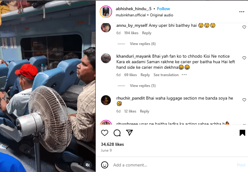 इस वीडियो पर सोशल मीडिया पर कमेंट्स की बाढ़ आ गई है. जहां कई यूजर्स ने इसे ‘देशी टेक्नोलॉजी’ करार दिया, वहीं कुछ ने ‘टेक्नोलॉजिया’ कहकर तारीफ की. दिलचस्प बात ये रही कि वीडियो में कैमरा फोकस तो उस पंखे वाले शख्स पर था, मगर यूजर्स की नजरें उस डिब्बे की ऊपरी लगेज कैरियर पर चली गईं, जहां लोग बैठे और कुछ तो लेट कर सोते नजर आए. लोगों ने कमेंट में लिखा- “भाईसाहब तो हवा के साथ टिकट का पूरा पैसा वसूल कर रहे हैं. एक अन्य यूजर ने कहा- “असली जुगाड़ तो इसे कहते हैं, ट्रेन में भी VIP फीलिंग ले रहे हैं.”