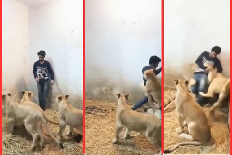 Viral Video: जंगली जानवरों के साथ मजाक? भई, ये कोई घर का पालतू कुत्ता नहीं कि पूंछ खींचकर हंसी-मजाक कर लो. सोशल मीडिया पर एक वीडियो तूफान की तरह वायरल हो रहा है, जिसमें एक बंदा तीन-तीन शेरनियों के बीच फंस गया है. अब ये बंदा पिंजरे में कैसे पहुंचा, ये तो वीडियो में रहस्य ही बना हुआ है, लेकिन जो दिख रहा है, वो किसी थ्रिलर मूवी से कम नहीं. वीडियो में साफ दिखता है कि शेरनियां उसे अपने पंजों में जकड़ने को तैयार हैं. बंदा बार-बार भागने की जुगत में है, पर हर बार शेरनियां उस पर झपट्टा मारती हैं. उसकी सांसें अटकी हुई दिख रही हैं. एक पल को लगता है, बंदा बच निकलेगा, लेकिन अगले ही पल शेरनी का पंजा उसे फिर से दबोच लेता है. ये वीडियो देखकर दिल धक-धक करता है.