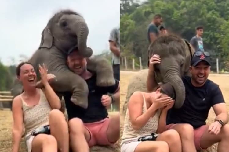 वीडियो देखकर लग रहा है कि पति-पत्नी चिड़ियाघर आए हुए हैं. दोनों जमीन पर बैठे हुए हैं और फोटो खींच रहे हैं. तभी एक छोटा सा हाथी उनके पास आता है. उसने एक प्यारा सैलून स्टाइल बना रखा है. बचपन में मां जैसे अपने बच्चों का बाल चेहरे के सामने गिराकर हेयर स्टाइल बनाती है, ठीक वैसा ही. हाथी पहले रुककर उन्हें देखता है कि वे कैसे फोटो खिंचवा रहे हैं. पति-पत्नी तरह-तरह के पोज और फनी चेहरे बनाकर फोटो ले रहे थे. छोटे हाथी को यह बहुत ही रोचक लगता है. वह चुपके-चुपके उनके पीछे चला जाता है और पहले अपनी सूंड दोनों के बीच में डालता है.
