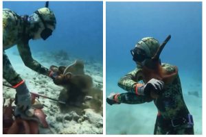 वीडियो में दिख रहा है कि कैसे एक गोताखोर जो पानी के तल में एक स्टिक के सहारे मिट्टी और पत्थरों को हटाकर एक ऑक्टोपस ढ़ूंढता है. उसने ऑक्टोपस को अपने हाथों से पकड़ लिया. लेकिन जल्द ही उसका दांव उलट गया. अचानक से ऑक्टोपस ने उसके हाथों को जकड़ लिया. वीडियो में साफ तौर पर देखा जा सकता है कि गोताखोर ऑक्टोपस के शिकंजे में आता चला गया. ऑक्टोपस ने अपनी लचीली और शक्तिशाली बाहों से गोताखोर के गले को जकड़ लिया, जिससे वह घबरा गया. गोताखोर ने तुरंत स्थिति को संभालने की कोशिश करते हुए अपने को उसकी पकड़ से छुड़ाने का कोशिश की. लेकिन ऑक्टोपस की मजबूत पकड़ ने उसे मुश्किल में डाल दिया. आखिरकार, गोताखोर किसी तरह पानी की सतह पर आ गया. इस पूरी घटना कैमरे में रिकॉर्ड हो हो गई, जो अब इंटरनेट पर तेजी से वायरल हो रहा है.