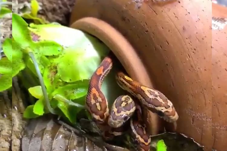 सोशल मीडिया पर वायरल हो रहे वीडियो में दिख रहा है कि जैसे ही कमला एक ओर झुका उसके अंदर से कई सांप अपना सिर बाहर की ओर निकाल रहे हैं. एक के बाद एक कर पूरे पांच सांप गमले रूपी घर में अपना गुजारा कर रहे हैं. 24 सेकंड के वीडियो में पहले दो सांप दिखाई दे रहे हैं. इसके बाद तीसरा फिर चौथा और अंत में पांचवां सांप गमले के बाहर अपना सिर निकाल कर बाहर की दुनिया को महसूस करने की कोशिश कर रहा है.