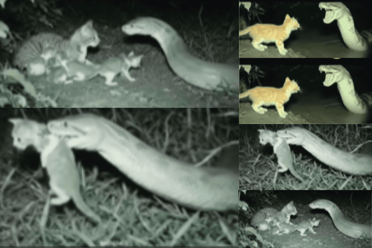 पहले लगता है कि शायद अजगर उसे जमीन पर मरने के लिए लेकर जा रहा है, लेकिन थोड़ी देर बाद जो वीडियो में दिखता है, वह शायद ही किसी ने सोचा होगा. अजगर बिल्ली के बच्चे को उठाकर उसकी मां के पास ले जाता है. उसकी मां बाकी बच्चों को जहां सुला रही होती है, अजगर उस बिल्ली के बच्चे को भी वहीं लाकर छोड़ देता है. उसकी मां जल्दी से उसे अपने पास ले गले लगाकर बैठा लेती और अजगर को देखने लगती है. उसे देखकर लगता है कि मानो वह अजगर का धन्यावाद कर रही है. यह वीडियो कहां का है, इसकी पुष्टि अभी नहीं हुई है.