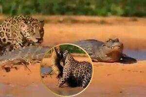 Viral Video: सोशल मीडिया पर एक वीडियो तेजी से वायरल हो रहा है. वीडियो में दिखाई दे रहा है कि एक जगुआर ने कैमन की गर्दन को अपने शक्तिशाली जबड़े में जकड़ लिया है. कैमन ने तड़पकर बचने की कोशिश की, लेकिन जगुआर की पकड़ से वो छूट नहीं पाया. देखते ही देखते जगुआर उसे दबोचकर पानी से होते निकल गया.
