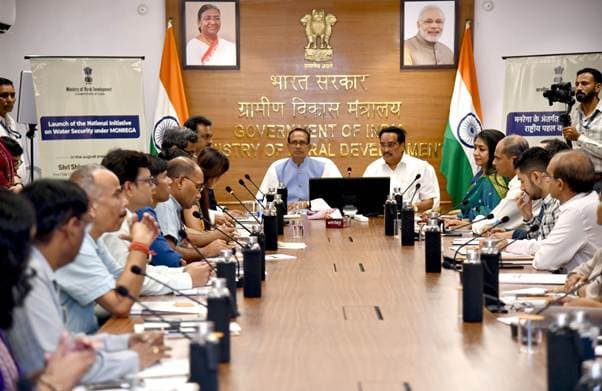 जल संचयन को बढ़ावा देने के लिए गुरुवार को केंद्रीय ग्रामीण विकास एवं कृषि और किसान कल्याण मंत्री शिवराज सिंह चौहान और केंद्रीय जल शक्ति मंत्री सीआर पाटिल ने संयुक्त रूप से जल सुरक्षा पर राष्ट्रीय पहल’ का शुभारंभ किया. इस दौरान केंद्रीय ग्रामीण विकास राज्य मंत्री कमलेश पासवान, ग्रामीण विकास विभाग के सचिव शैलेश सिंह और दोनों ही मंत्रालय के वरिष्ठ अधिकारी मौजूद रहे. साथ ही वर्चुअली देश के ग्रामीण ब्लॉकों के प्रतिनिधियों और जिलाधिकारी शामिल हुए.