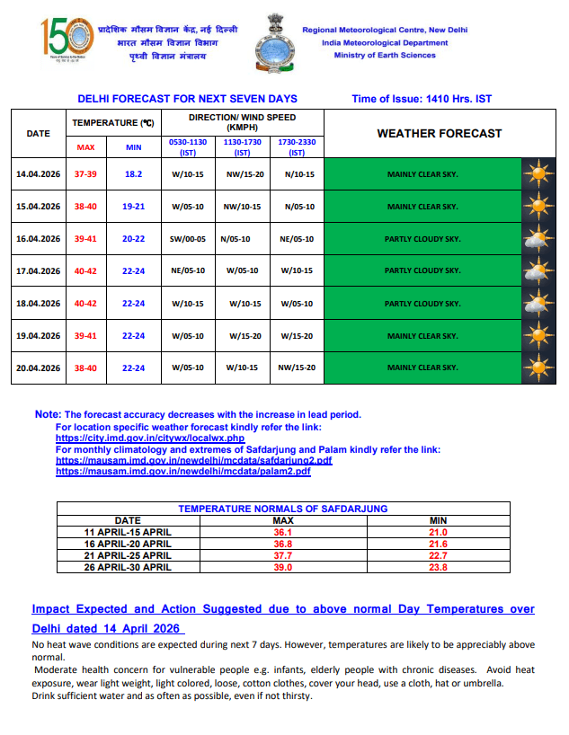 दिल्ली में अगले सात दिनों तक मौसम ज्यादातर साफ रहने वाला है, हालांकि 16 से 18 अप्रैल के बीच आसमान आंशिक रूप से बादलों से ढका रह सकता है. इस दौरान अधिकतम तापमान 37 से 42 डिग्री सेल्सियस और न्यूनतम तापमान 18 से 24 डिग्री के बीच रहने की संभावना है. तापमान सामान्य से थोड़ा ज्यादा रह सकता है, जिससे हल्की गर्मी महसूस होगी, लेकिन फिलहाल लू चलने के आसार नहीं हैं.
