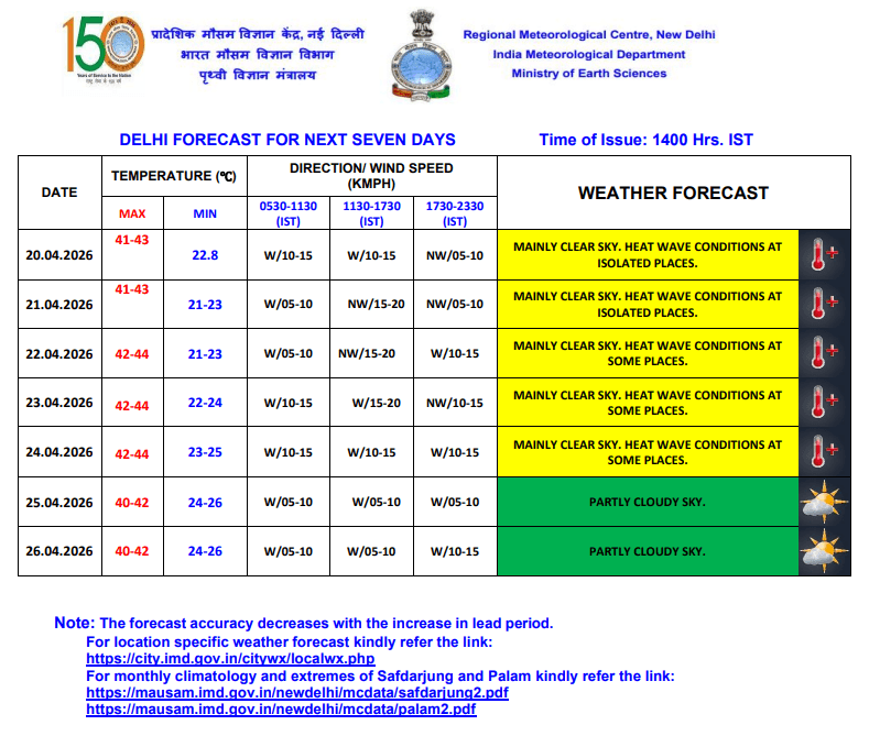 दिल्ली में 21 से 24 अप्रैल के बीच मौसम मुख्य रूप से साफ रहने की संभावना है. कई जगहों पर हीट वेव यानी लू का असर देखने को मिल सकता है. अधिकतम तापमान करीब 41 से 44 डिग्री सेल्सियस तक जा सकता है, जबकि न्यूनतम तापमान लगभग 21 से 25 डिग्री के बीच रहेगा. कुछ दिनों में गर्म हवाएं भी चलेंगी, जिससे लोगों को तेज गर्मी और उमस का सामना करना पड़ सकता है. कुल मिलाकर दिल्ली में इन दिनों अधिक गर्मी का असर बना रहेगा.