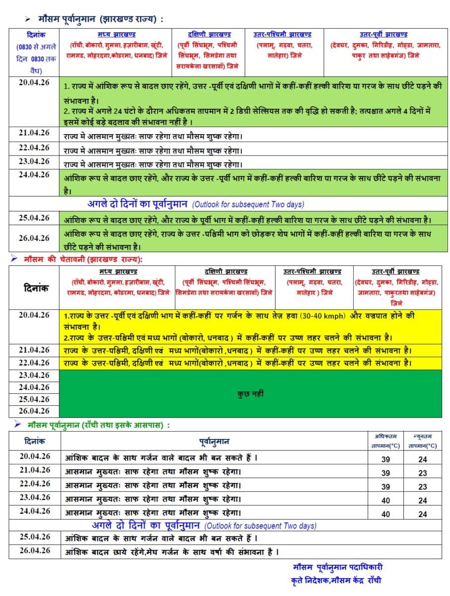 21 से 23 अप्रैल तक झारखंड का मौसम मुख्यतः साफ और शुष्क रहेगा. 21 और 22 अप्रैल को उत्तर-पश्चिमी, दक्षिणी और मध्य भागों में कहीं-कहीं लू चल सकती है. 24 अप्रैल को फिर से आंशिक बादल और उत्तर-पूर्वी हिस्सों में हल्की बारिश के आसार हैं. कुल मिलाकर राज्य में गर्मी का असर बना रहेगा, बीच-बीच में बादल और हल्की बारिश से थोड़ी राहत मिल सकती है.