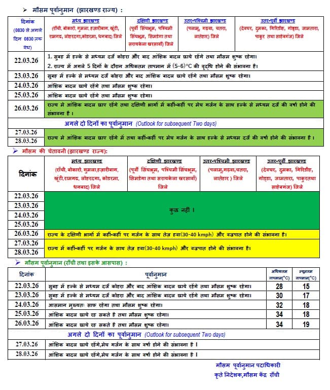 झारखंड में 23 से 26 मार्च के बीच मौसम मिलाजुला रहने वाला है. हल्के से मध्यम बादल छाए रहेंगे और मौसम शुष्क रहेगा. 23 मार्च से तापमान में 5-6 डिग्री तक बढ़ोतरी हो सकती है. 24-25 मार्च को आंशिक बादल रहेंगे, लेकिन बारिश के आसार कम हैं. वहीं 26 मार्च को दक्षिणी हिस्सों में कहीं-कहीं गरज के साथ हल्की से मध्यम बारिश हो सकती है.