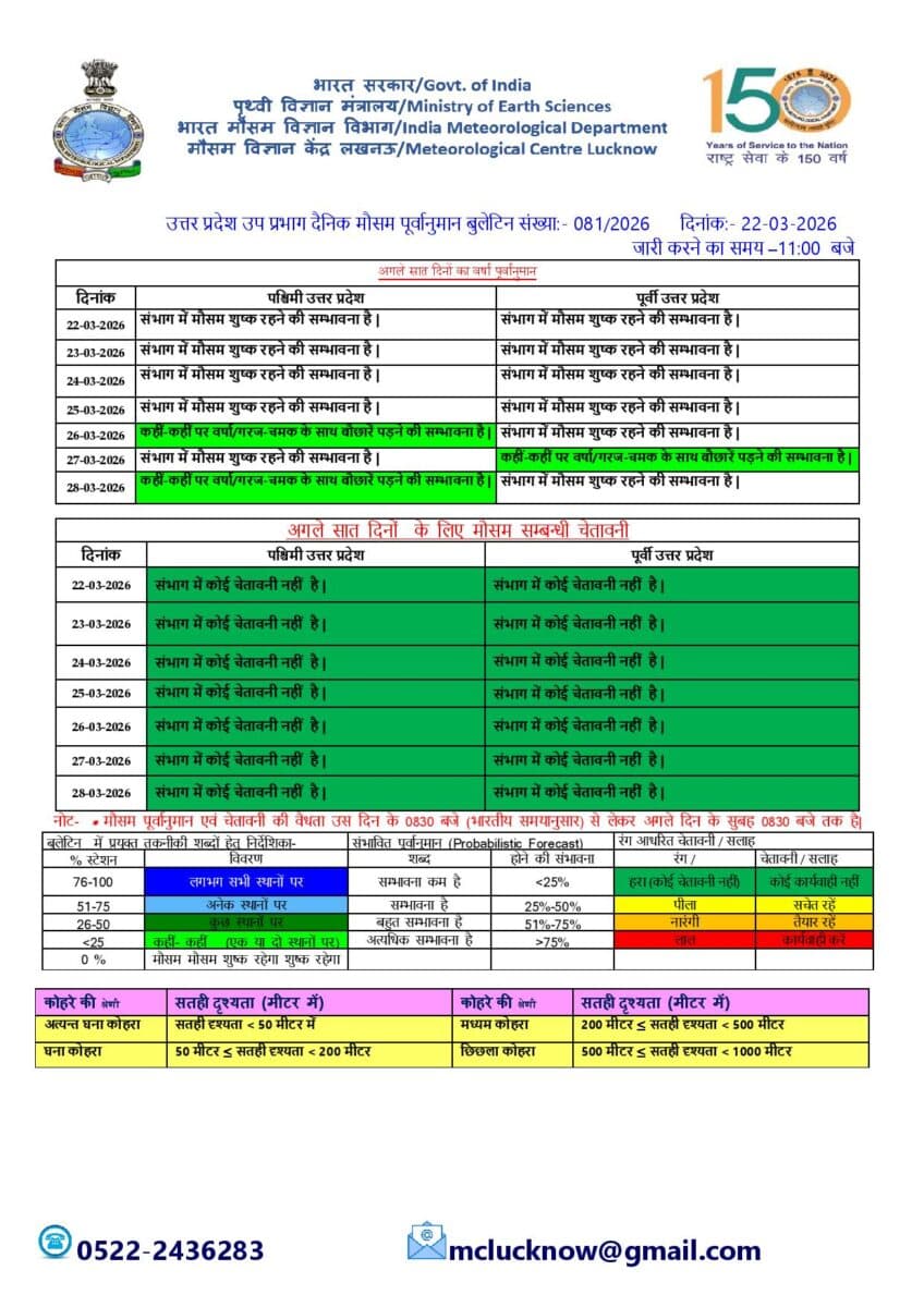 उत्तर प्रदेश में 23 से 25 मार्च तक मौसम ज्यादातर शुष्क रहने की संभावना है. प्रदेश के दोनों हिस्सों (पूर्वी व पश्चिमी यूपी) में खास बदलाव नहीं दिखेगा. 26 मार्च से मौसम करवट ले सकता है. कुछ जगहों पर गरज-चमक के साथ बारिश और ओले गिरने की संभावना है. खासकर पश्चिमी यूपी में मौसम बदल सकता है. 27 मार्च को पूर्वी यूपी में भी कहीं-कहीं बारिश और ओलावृष्टि हो सकती है.