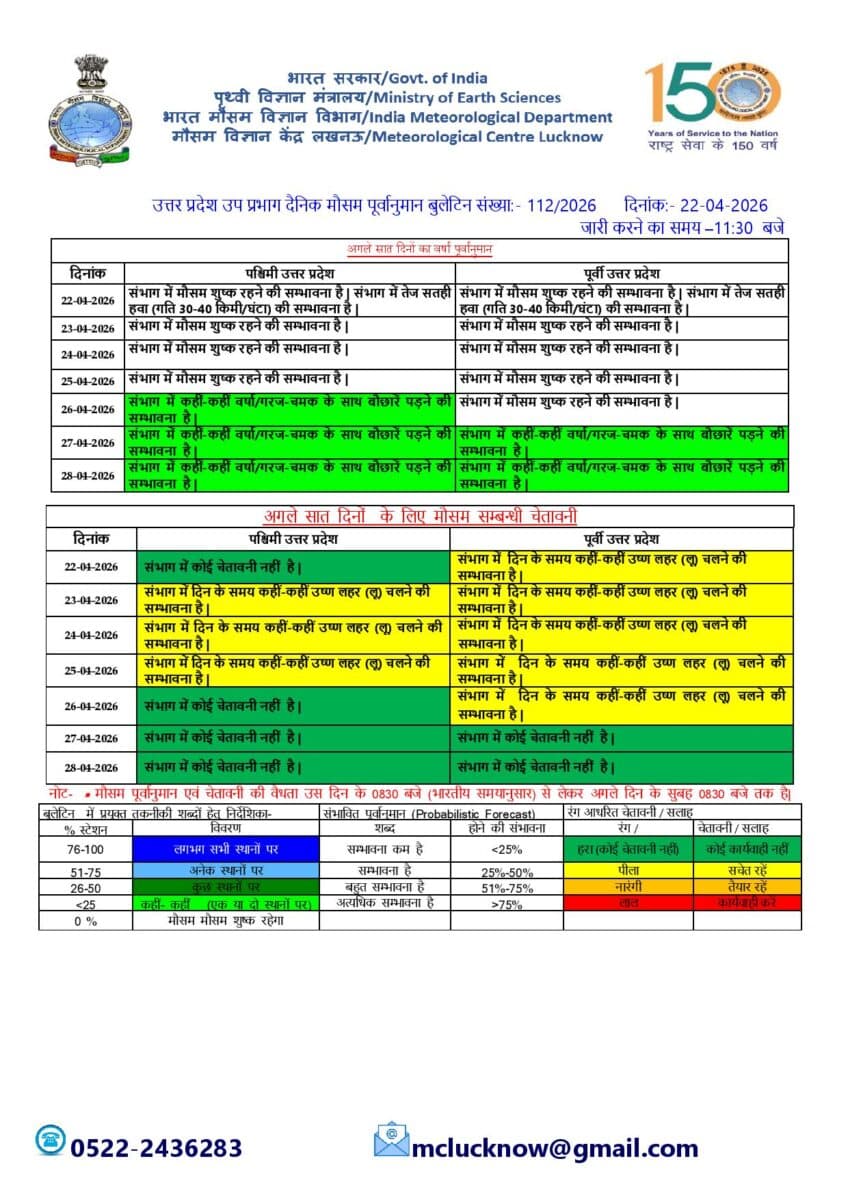 उत्तर प्रदेश में 23 से 28 अप्रैल के बीच मौसम ज्यादातर शुष्क बना रहेगा. 23 से 25 अप्रैल तक आसमान साफ रहने और गर्मी बढ़ने की संभावना है, वहीं दिन के समय कई इलाकों में लू चल सकती है, खासकर पूर्वी उत्तर प्रदेश में. 26 से 28 अप्रैल के बीच मौसम में हल्का बदलाव देखने को मिलेगा और कुछ जगहों पर गरज-चमक के साथ बूंदाबांदी हो सकती है.