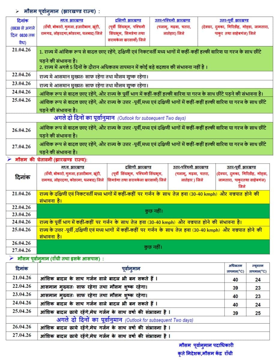 झारखंड में 23 से 27 अप्रैल के बीच मौसम मिलाजुला रहने वाला है. ज्यादातर दिनों में आंशिक रूप से बादल छाए रहेंगे. 23 अप्रैल को आसमान साफ और मौसम शुष्क रहने की संभावना है. 24 से 27 अप्रैल के बीच राज्य के कई हिस्सों, खासकर उत्तर-पूर्व, मध्य और दक्षिणी क्षेत्रों में कहीं-कहीं हल्की बारिश या गरज के साथ छींटे पड़ सकते हैं. इस दौरान कुछ जगहों पर 30-40 किमी/घंटा की रफ्तार से तेज चलने की संभावना है.