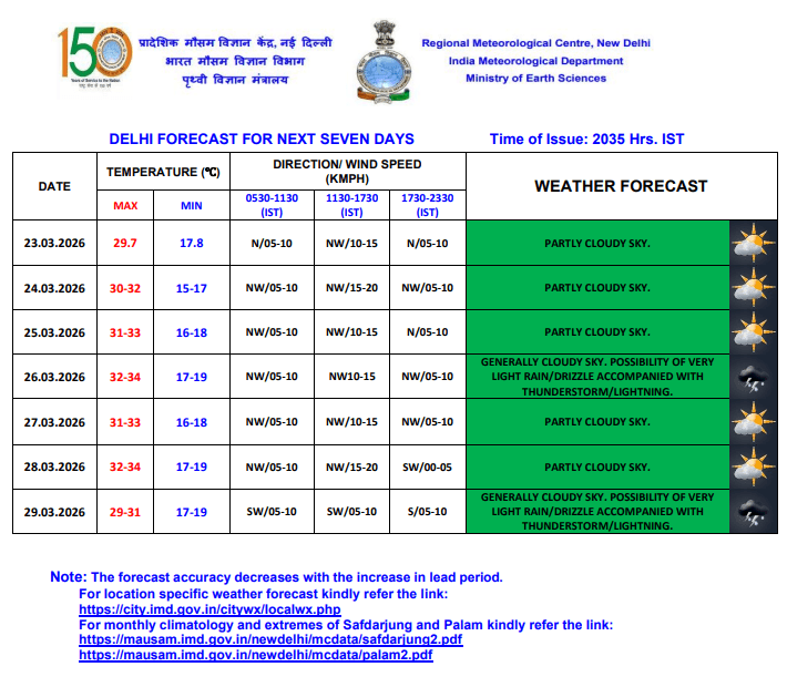दिल्ली में 24 से 29 मार्च के दौरान मौसम ज्यादातर आंशिक रूप से बादलों भरा रहने वाला है. 26 मार्च को आसमान सामान्यतः बादलों से घिरा रहेगा और हल्की बारिश या बूंदाबांदी के साथ गरज-चमक की संभावना है. इसके बाद 27 और 28 मार्च को फिर से मौसम आंशिक रूप से साफ और बादलों वाला रहेगा. वहीं 29 मार्च को एक बार फिर बादल छाए रहने के साथ हल्की बारिश और गरज-चमक हो सकती है.