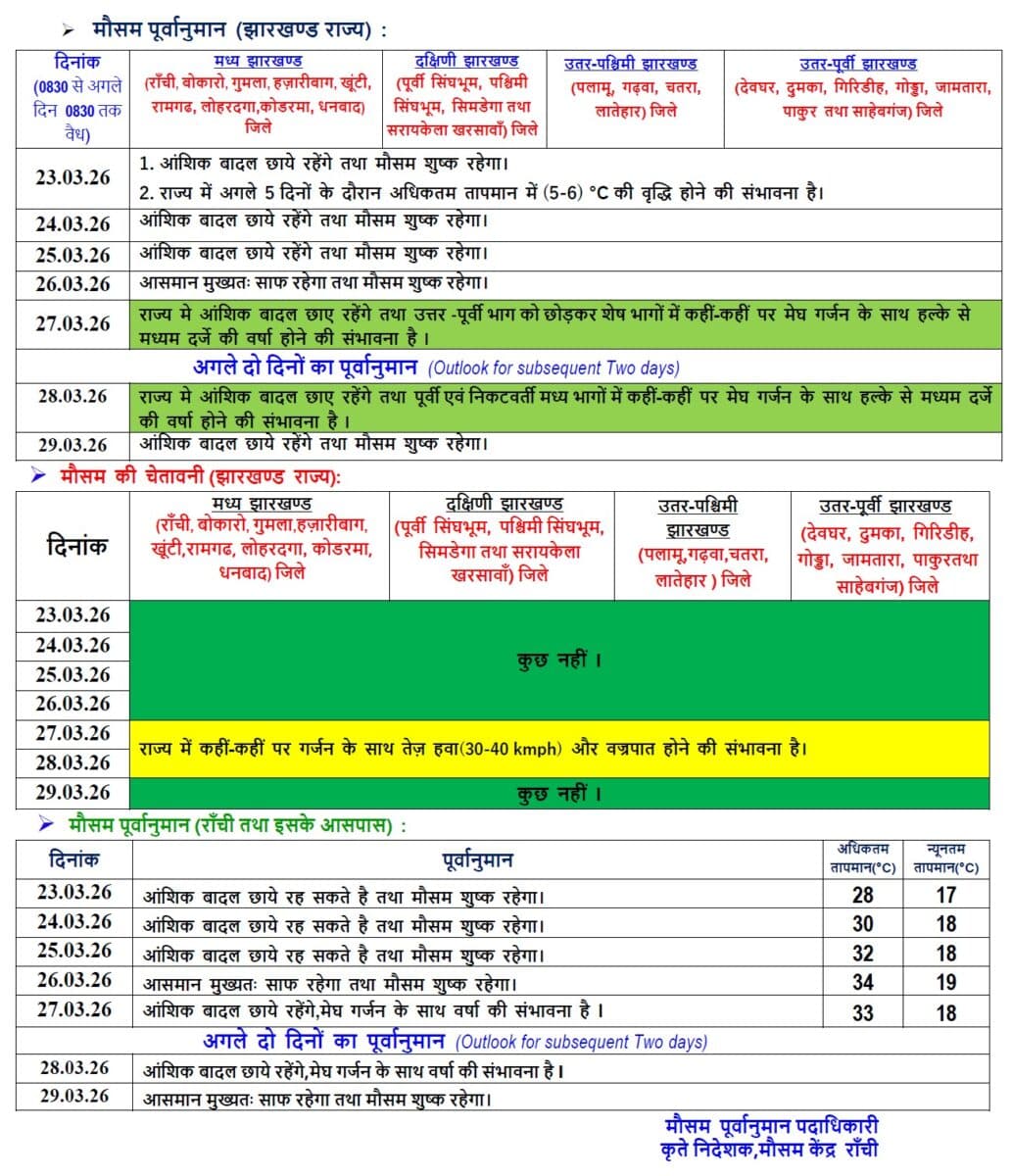झारखंड में 24 से 29 मार्च के दौरान मौसम में धीरे-धीरे बदलाव देखने को मिलेगा. शुरुआती दिनों (23–25 मार्च) में आंशिक बादल छाए रहेंगे और मौसम शुष्क रहेगा, जबकि 26 मार्च को आसमान मुख्यतः साफ रहने की संभावना है. इसके बाद 27 और 28 मार्च को राज्य के कई हिस्सों में मेघ गर्जन के साथ हल्की से मध्यम बारिश हो सकती है. खासकर पूर्वी और आसपास के क्षेत्रों में. इस दौरान 30–40 किमी/घंटा की रफ्तार से तेज हवा और वज्रपात की भी संभावना है.