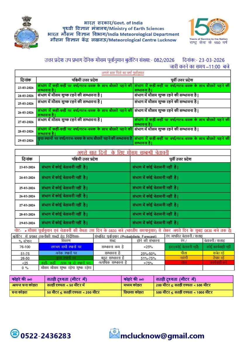 उत्तर प्रदेश में 24 से 28 मार्च के दौरान मौसम में उतार-चढ़ाव देखने को मिलेगा. 24 और 25 मार्च को पूरे प्रदेश में मौसम मुख्यतः शुष्क रहेगा. 26 मार्च को पश्चिमी यूपी में फिर से कहीं-कहीं बारिश और गरज-चमक के आसार हैं, जबकि पूर्वी यूपी में मौसम शुष्क रहेगा. 27 मार्च को पूर्वी हिस्सों में हल्की बारिश की संभावना है. 28 मार्च को पश्चिमी यूपी में फिर से कहीं-कहीं बौछारें पड़ सकती हैं, जबकि पूर्वी भाग में मौसम शुष्क रहेगा.