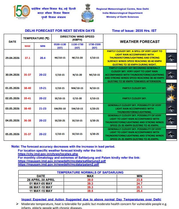 दिल्ली में 30 अप्रैल से 3 मई 2026 के बीच मौसम मिलाजुला रहने का अनुमान है. इस दौरान दिन का तापमान लगभग 35 से 40 डिग्री सेल्सियस के बीच रहेगा, जबकि रात का तापमान 19 से 23 डिग्री के आसपास बना रहेगा. 30 अप्रैल और 3 मई को हल्की बारिश और तेज हवाएं (40–50 किमी/घंटा तक) चलने की संभावना है.