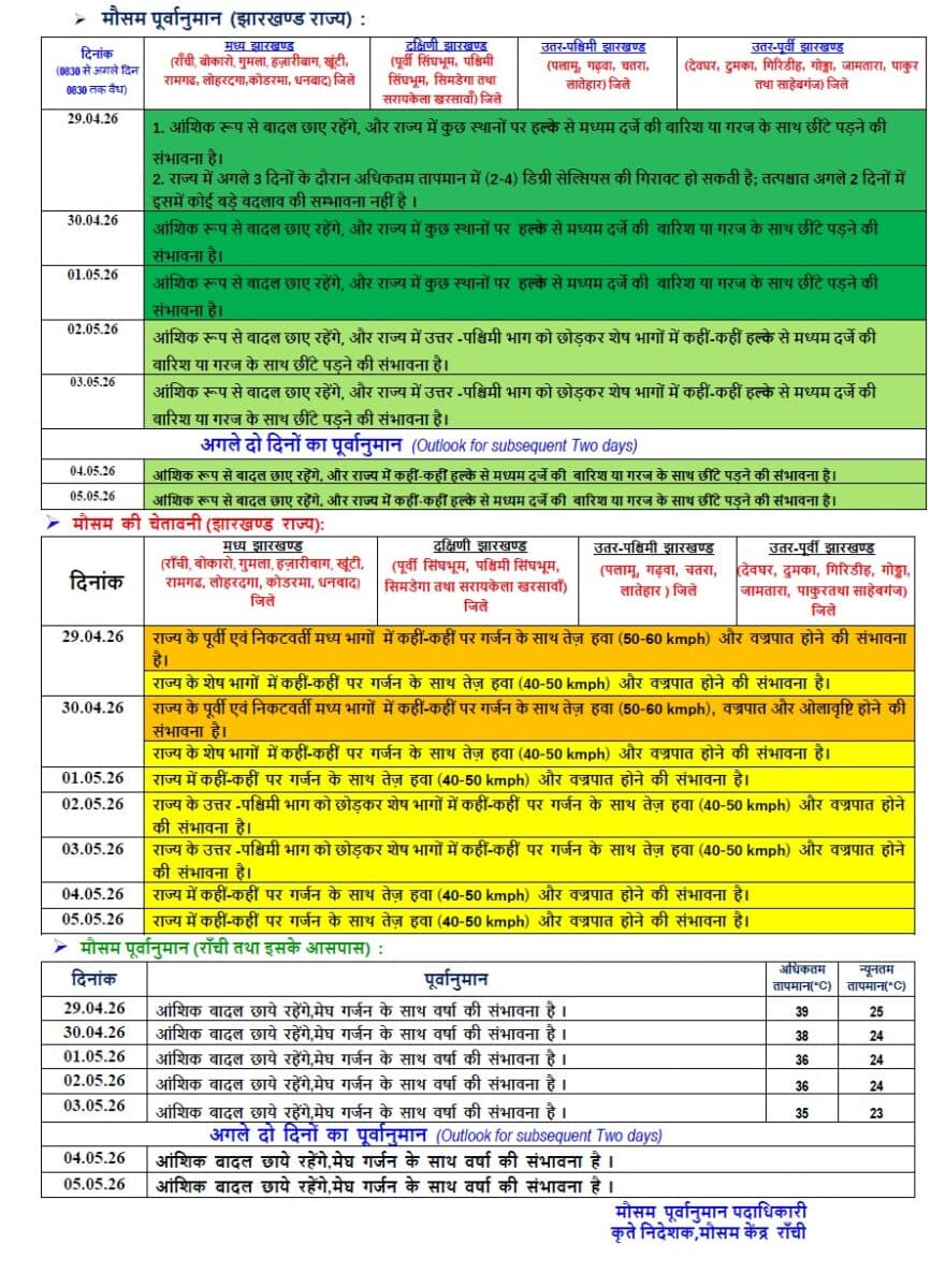 झारखंड में 30 अप्रैल से 3 मई के बीच मौसम का मिजाज बदला-बदला रहेगा. इस दौरान आसमान आंशिक रूप से बादलों से ढका रहेगा और कई जगहों पर हल्की से मध्यम बारिश के साथ गरज-चमक देखने को मिल सकती है. कुछ इलाकों में 40–50 किमी/घंटा की रफ्तार से तेज हवाएं चलने और वज्रपात की भी संभावना है. 30 अप्रैल को पूर्वी और मध्य हिस्सों में तेज हवा (50–60 किमी/घंटा) और ओलावृष्टि की आशंका जताई गई है. तापमान में अगले 3 दिनों में 2-4 डिग्री की गिरावट हो सकती है, जिससे गर्मी से थोड़ी राहत मिलेगी.