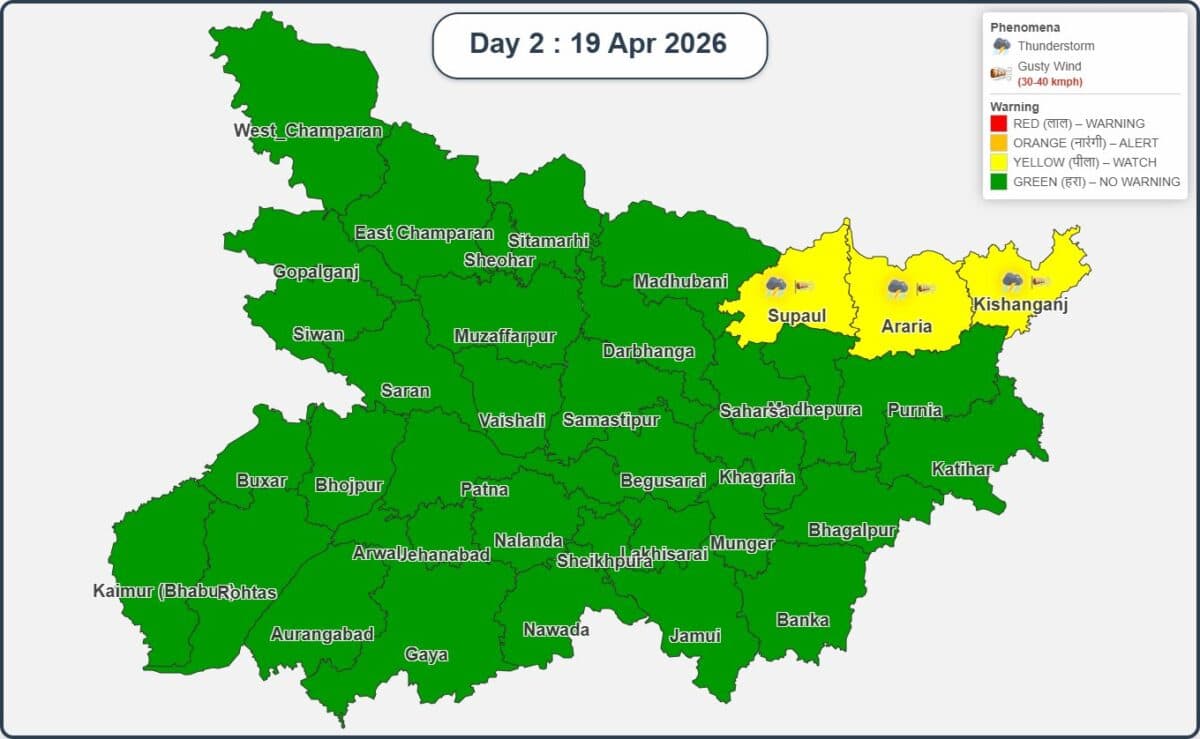 बिहार में 19 अप्रैल को अधिकांश जिलों में मौसम सामान्य रहने की संभावना है. राज्य के ज्यादातर हिस्सों में आसमान साफ या हल्के बादल रह सकते हैं. हालांकि, उत्तर-पूर्वी जिलों जैसे सुपौल, अररिया और किशनगंज में कहीं-कहीं गरज के साथ हल्की बारिश और 30-40 किमी/घंटा की रफ्तार से तेज हवा चलने की संभावना है. यहां येलो अलर्ट जारी किया गया है.