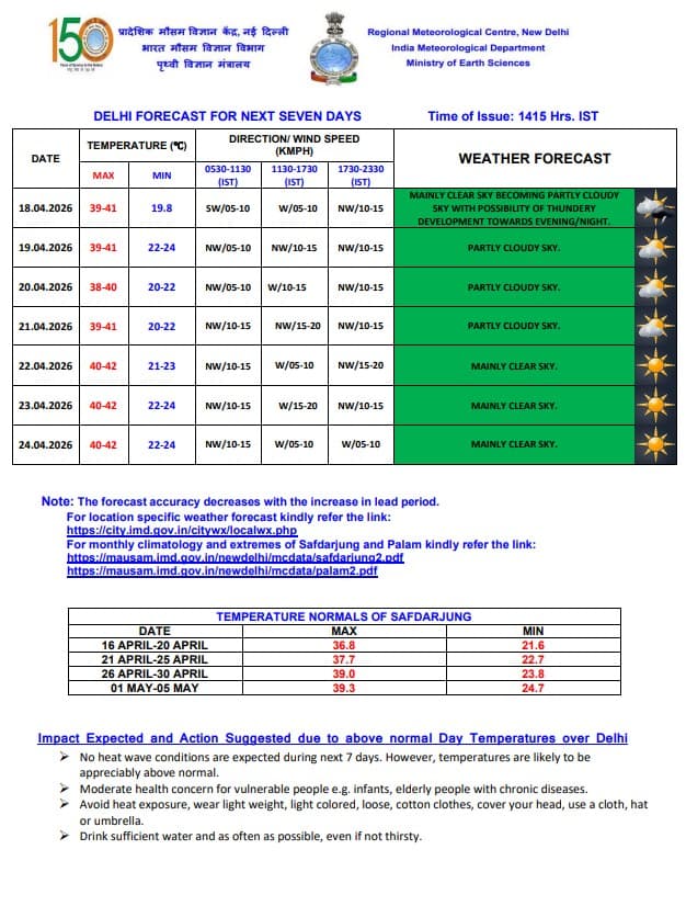दिल्ली में 19 से 21 अप्रैल तक आंशिक बादल छाए रहेंगे. इसके बाद 22 से 24 अप्रैल तक मौसम फिर से मुख्य रूप से साफ रहेगा. इस दौरान अधिकतम तापमान करीब 38 से 42 डिग्री सेल्सियस और न्यूनतम तापमान 19 से 24 डिग्री के बीच रहने की संभावना है. गर्मी सामान्य से ज्यादा महसूस हो सकती है.