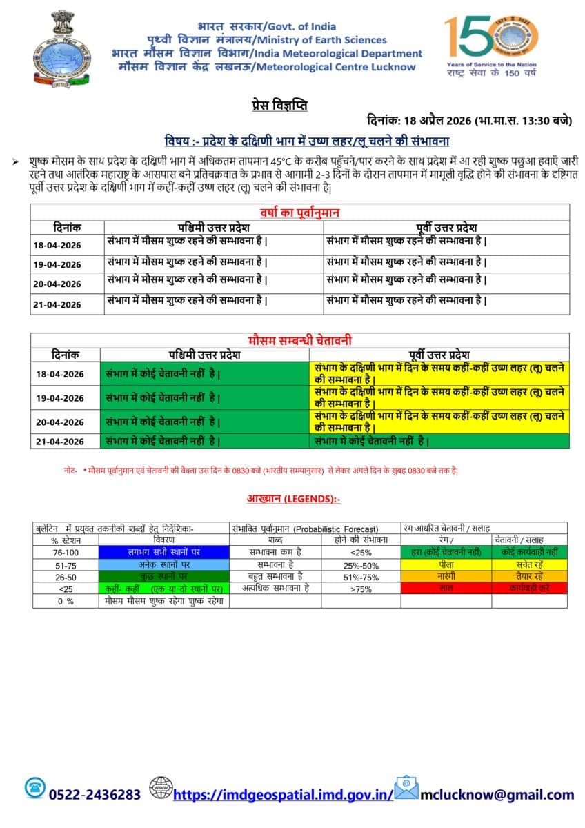 उत्तर प्रदेश में आने वाले कुछ दिनों तक मौसम शुष्क रहने की संभावना है. खासकर प्रदेश के दक्षिणी हिस्सों में तापमान बढ़कर करीब 45°C तक पहुंच सकता है, जिससे लू चलने के आसार हैं. अगले 2–3 दिनों में तापमान में हल्की बढ़ोतरी हो सकती है. पूर्वी यूपी के कुछ इलाकों में दिन के समय कहीं-कहीं लू चलने की चेतावनी जारी की गई है, जबकि पश्चिमी यूपी में फिलहाल कोई विशेष चेतावनी नहीं है. कुल मिलाकर, प्रदेश में गर्म और शुष्क मौसम बना रहेगा.