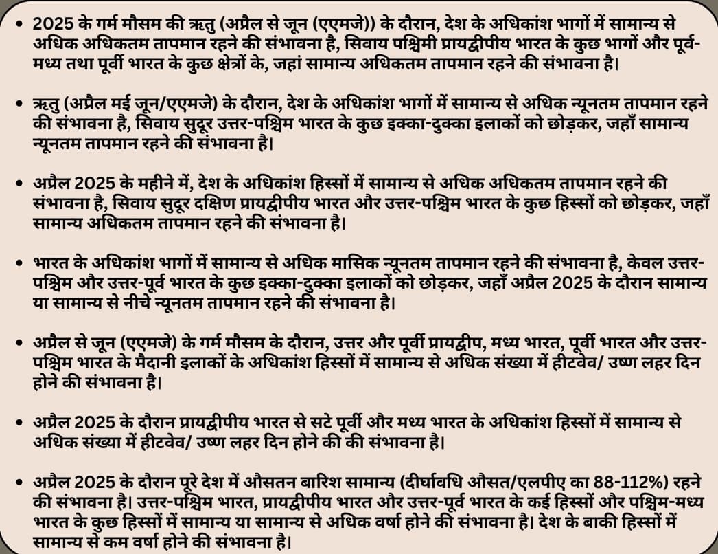 आईएमडी के प्रमुख मृत्युंजय महापात्रा ने मीडिया से बात करते हुए कहा कि पश्चिमी और पूर्वी भारत के कुछ क्षेत्रों को छोड़कर देश के अधिकांश हिस्सों में अधिकतम तापमान सामान्य से अधिक रहेगा. उन्होंने कहा कि अधिकांश क्षेत्रों में न्यूनतम तापमान भी सामान्य से अधिक रहने की संभावना है. महापात्रा ने कहा “अप्रैल से जून तक उत्तर और पूर्वी भारत के अधिकांश हिस्सों, मध्य भारत और उत्तर-पश्चिम भारत के मैदानी इलाकों में सामान्य से दो से चार दिन अधिक लू चलने की संभावना है.” उन्होंने बताया कि आमतौर पर भारत में अप्रैल से जून तक चार से सात दिन तक लू चलती है.