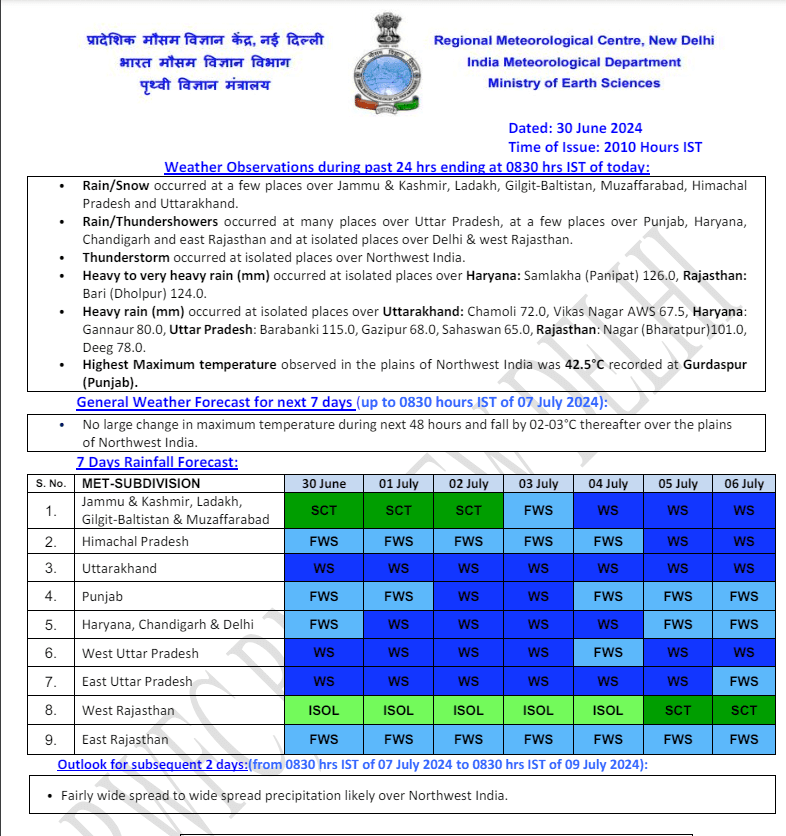 मौसम विभाग के अनुसार, अगले दो से तीन दिनों में हरियाणा, चंडीगढ़, पंजाब के अधिक भागों और पश्चिमी उत्तर प्रदेश, हिमाचल प्रदेश में मानसून के आगे बढ़ने के लिए परिस्थितियां अनुकूल बनी हुई है.