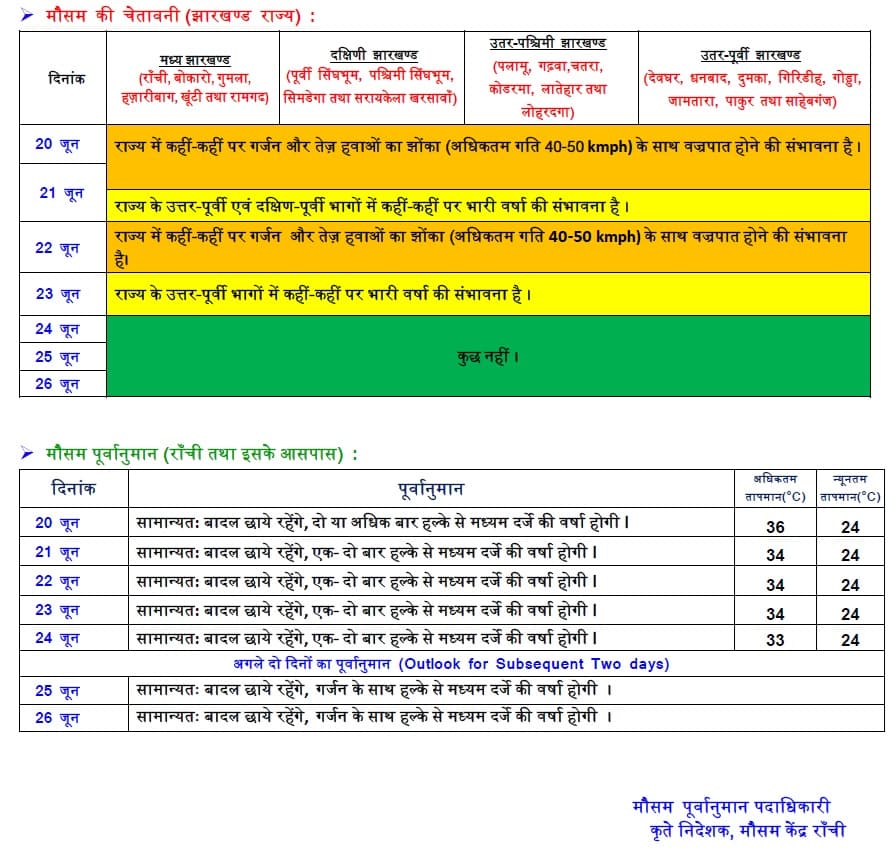 झारखंड के कई जिलों में बारिश देखने को मिल रही है जिससे लोगों को गर्मी से कुछ राहत मिली है. गर्मी झेल रहे लोगों को और राहत मिलने की संभावना है, ऐसा इसलिए क्योंकि मानसून धीरे-धीरे झारखंड की ओर बढ़ता जा रहा है और आने वाले दिनों में राज्य में मानसून की बारिश शुरू हो जाएगी. मौसम विभाग की मानें तो, शुक्रवार को उत्तर-पूर्वी एवं दक्षिण-पूर्वी भागों में कहीं-कहीं भारी बारिश के आसार हैं.