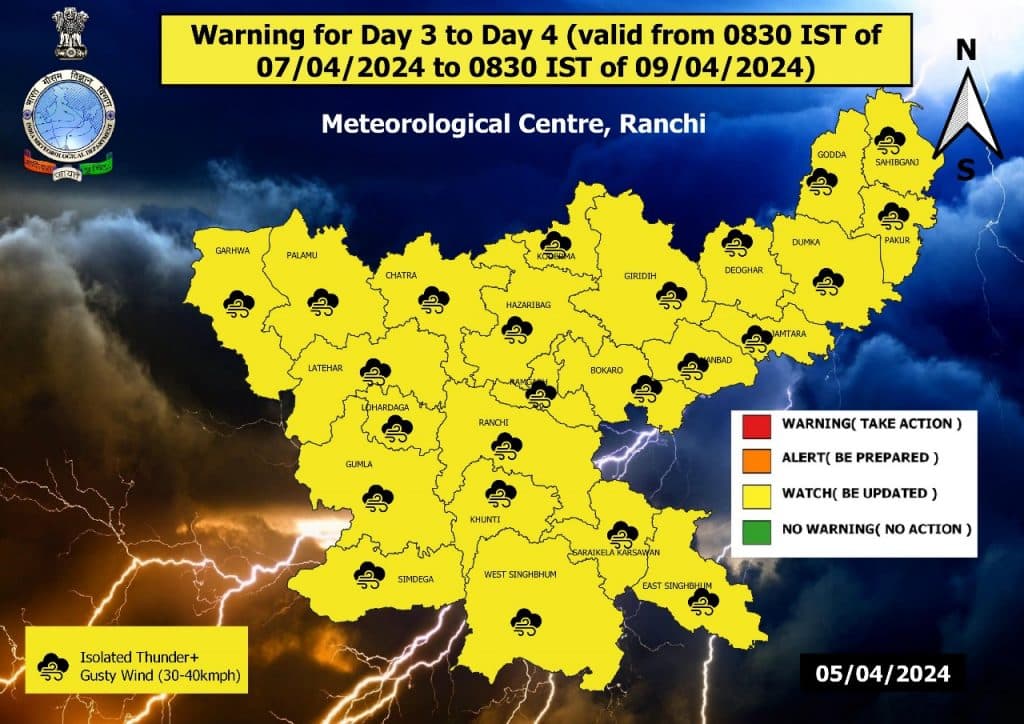 झारखंड के मौसम पर नजर डालें तो मौसम विभाग ने 9 अप्रैल तक के लिए येलो अलर्ट जारी किया है. विभाग की मानें तो, 6 अप्रैल को दिन और रात में लोगों को गर्मी परेशान करेगी. इसके बाद 7 अप्रैल से कुछ राहत मिलेगी. इस दिन कहीं-कहीं गरज के साथ तेज हवाओं से राहत मिल सकती है. 8 अप्रैल और 9 अप्रैल को भी ऐसी ही स्थिति नजर आएगी. मौसम विभाग के प्रमुख अभिषेक आनंद ने बताया कि 7 अप्रैल से 9 अप्रैल के बीच होने वाली बारिश से लोगों को भीषण गर्मी से थोड़ा राहत मिल सकती है.