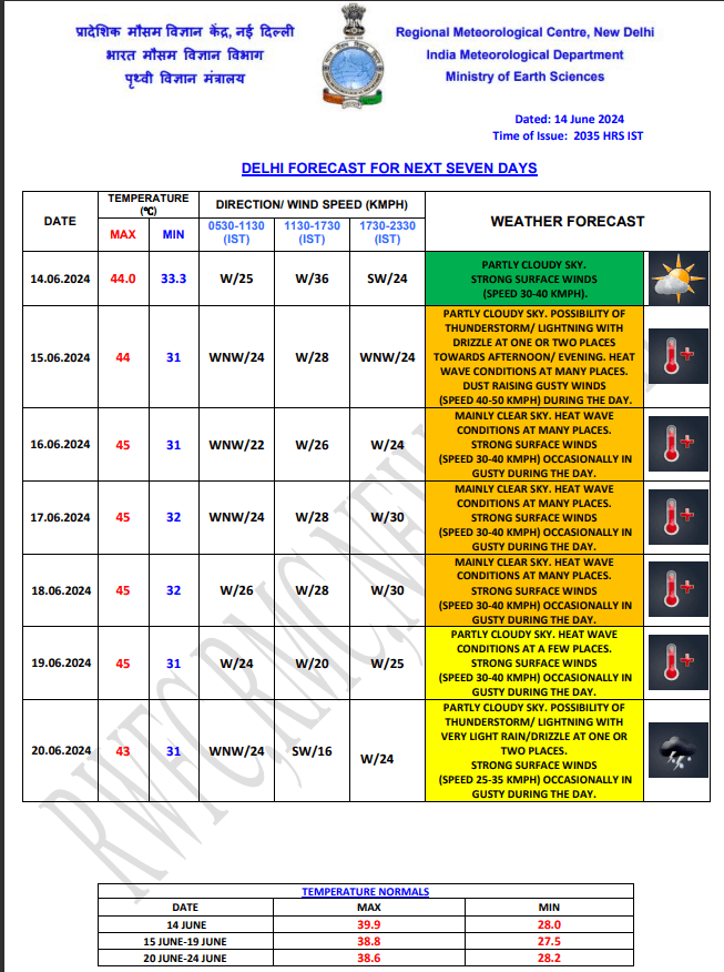 Weather Forecast: दिल्ली में अभी गर्मी का दौर जारी रहेगा. आज भी यहां का पारा 40 डिग्री के पार रहेगा. मौसम विभाग के अनुसार, शनिवार को राजधानी का अधिकतम तापमान 44 डिग्री सेल्सियस जबकि न्यूनतम तापमान 31 डिग्री सेल्सियस रिकॉर्ड किया जा सकता है. रविवार से अधिकतम तापमान में इजाफा होगा. दिल्ली में 20 जून को हल्की बारिश की संभावना व्यक्त की गई है. जानें देश के अन्य राज्यों के मौसम का हाल