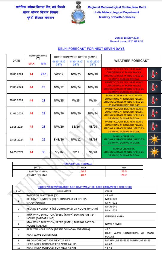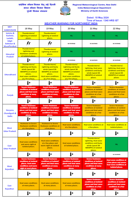 उत्तर-पश्चिम भारत के विभिन्न हिस्सों में पड़ रही भीषण गर्मी अगले पांच दिन और जारी रहने का पूर्वानुमान जारी किया गया है. राजधानी दिल्ली, हरियाणा, पंजाब के अलावा राजस्थान व उत्तर प्रदेश में इसका सबसे अधिक प्रभाव देखने को मिल सकता है. मौसम विभाग ने दिल्ली, हरियाणा, पंजाब और पश्चिम राजस्थान के लिए “रेड” अलर्ट जारी करने का काम किया है. मौसम विभाग ने पूर्वी राजस्थान, उत्तर प्रदेश और बिहार के लिए ‘ऑरेंज अलर्ट’ जारी किया है. विभाग की ओर से कहा गया है कि शिशुओं, बुजुर्गों व पुरानी बीमारियों से ग्रस्त लोगों समेत संवेदनशील लोगों की देखभाल करने की जरूरत है.