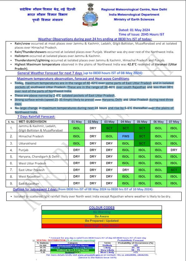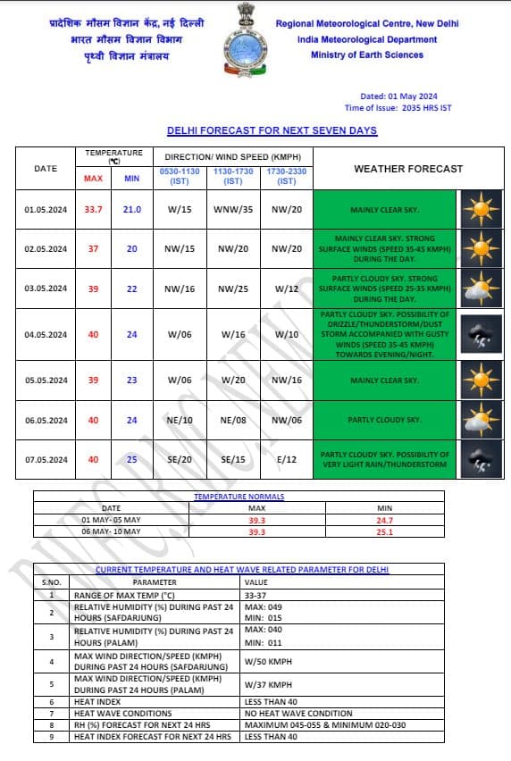 भारत मौसम विभाग (आईएमडी) की ओर से जो जानकारी दी गई है उसके अनुसार, दिल्ली सहित उत्तर भारत के ज्यादातर हिस्सों में मई के महीने में अधिकतम और न्यूनतम तापमान सामान्य से ज्यादा रिकॉर्ड किया जा सकता है. यहां दो से चार दिन लू चलने की संभावना है. पूर्वोत्तर भारत के अधिकतर इलाकों, उत्तर पश्चिम भारत, मध्य भारत के कुछ हिस्सों तथा पूर्वोत्तर प्रायद्वीपीय भारत को छोड़ दें तो इसके बाद जो देश के अधिकांश हिस्से शेष है, वहां अधिकतम तापमान सामान्य से अधिक रह सकता है.