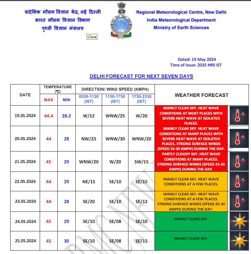 Weather Forecast: राष्ट्रीय राजधानी में रविवार को तापमान 44.4 डिग्री सेल्सियस रिकॉर्ड किया गया. मौसम विभाग ने दिल्ली में भीषण गर्मी के कारण ‘रेड अलर्ट’ जारी किया है. मौसम विभाग (आईएमडी) ने सोमवार को दिल्ली में मोटे तौर पर आसमान साफ रहने का पूर्वानुमान जारी किया है, साथ ही कई हिस्सों में भीषण गर्मी पड़ने और 25-35 किलोमीटर प्रति घंटे की रफ्तार से तेज हवाएं चलने का अनुमान व्यक्त किया गया है. सात दिन के लिए पूर्वानुमान जताते हुए विभाग ने भीषण गर्मी के कारण संवेदनशील लोगों के लिए अत्याधिक एहतियात बरतने की अपील की है. जानें देश के अन्य राज्यों के मौसम का हाल