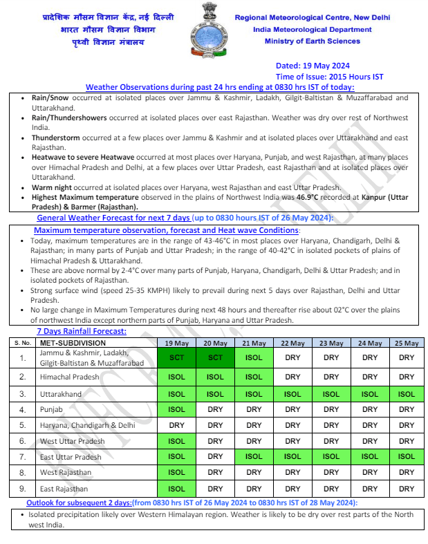 मौसम विभाग की मानें तो, 20-21 मई को गढ़वा, पलामू, देवघर के साथ-साथ जामताड़ा, दुमका, गोड्डा, पाकुड़ और साहिबगंज में हीट वेव चल सकती है. वहीं झारखंड के पूर्वी, दक्षिणी तथा मध्य हिस्से में कहीं-कहीं गर्जन के साथ बारिश के आसार हैं. राजधानी रांची में 25 मई तक आंशिक बादल छाये रहेंगे.