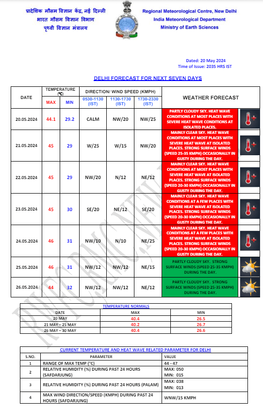 Weather Forecast: दिल्ली समेत उत्तर भारत के कई हिस्से भीषण गर्मी की चपेट में नजर आ रहे हैं. मौसम विभाग (आईएमडी) ने अगले पांच दिन के लिए ‘रेड अलर्ट’ जारी करते हुए दिल्ली के कई हिस्सों में लू चलने और अन्य इलाकों में भीषण लू चलने का पूर्वानुमान व्यक्त किया है. मंगलवार को दिल्ली का अ्रधिकतम तापमान 45 डिग्री सेल्सियस जबकि न्यूनतम तापमान 29 डिग्री सेल्सियस रिकॉर्ड किया जा सकता है. 24 मई को पारा 46 डिग्री सेल्सियस तक पहुंचने की आशंका है. जानें देश के अन्य राज्यों के मौसम का हाल