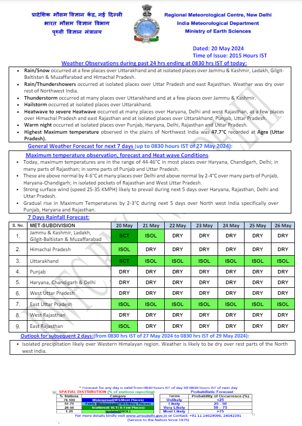 स्काइमेट वेदर के अनुसार, सिक्किम, लक्षद्वीप के साथ-साथ उत्तराखंड और पूर्वोत्तर भारत में हल्की से मध्यम बारिश हो सकती है. वहीं पश्चिमी हिमालय, छत्तीसगढ़, पश्चिम बंगाल, ओडिशा और दक्षिणी मध्य प्रदेश में हल्की बारिश देखने को मिल सकती है. हरियाणा, दिल्ली, यूपी, राजस्थान और मध्य प्रदेश के कुछ जिलों में लू चलने का अनुमान लगाया गया है.