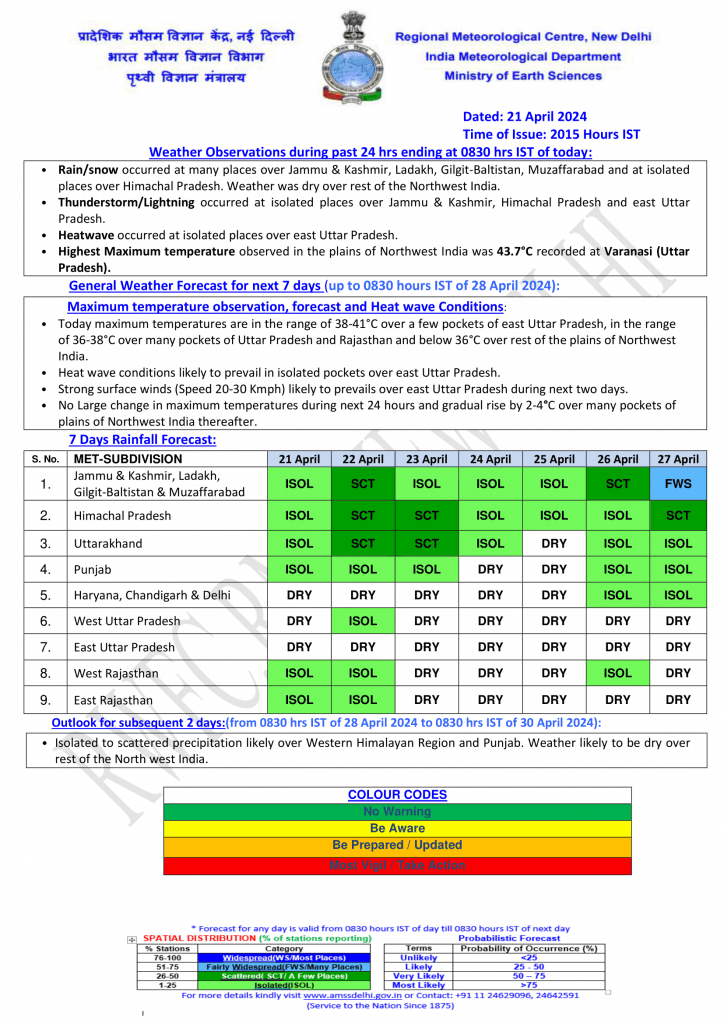 मौसम का पूर्वानुमान बताने वाली निजी संस्था स्काइमेट वेदर के अनुसार, 22 से 26 अप्रैल के बीच जम्मू-कश्मीर, लद्दाख, हिमाचल प्रदेश और उत्तराखंड में बारिश के साथ-साथ बर्फबारी के आसार हैं. वहीं 22 से 23 अप्रैल के बीच उत्तरी पंजाब, उत्तरी हरियाणा में तेज हवाओं के साथ बारिश की संभावना है.