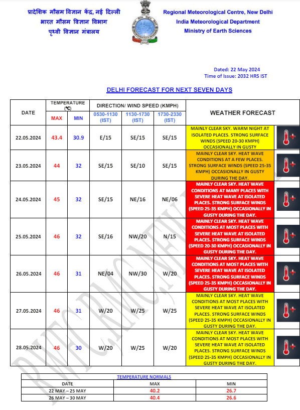 Weather Forecast: दिल्ली-एनसीआर के इलाकों में गर्मी का दौर जारी है. दिल्ली में गुरुवार को आसमान साफ रहेगा. कुछ जगह में लू चल सकती है. आज राजधानी का अधिकतम तापमान 44 डिग्री सेल्सियस जबकि न्यूनतम तापमान 32 डिग्री सेल्सियस रिकॉर्ड किया जा सकता है. शुक्रवार से राजधानी का पारा और चढ़ेगा. जानें देश के अन्य राज्यों के मौसम का हाल