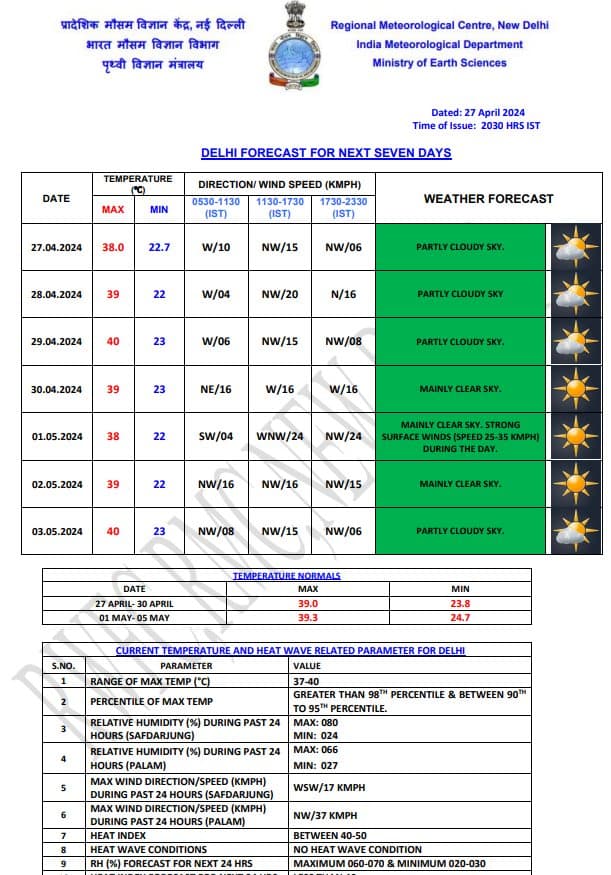 Weather Forecast: दिल्ली-एनसीआर में गर्मी का दौर जारी है. राजधानी की बात करें तो यहां आज आकाश में आंशिक बादल छाए नजर आ सकते हैं. यहां 30 अप्रैल से मौसम शुष्क हो जाएगा. रविवार को दिल्ली का अधिकतम तापमान 39 डिग्री सेल्सियस रिकॉर्ड किया जा सकता है जबकि न्यूनतम तापमान 22 डिग्री सेल्सियस रह सकता है. जानें देश के अन्य राज्यों के मौसम का हाल
