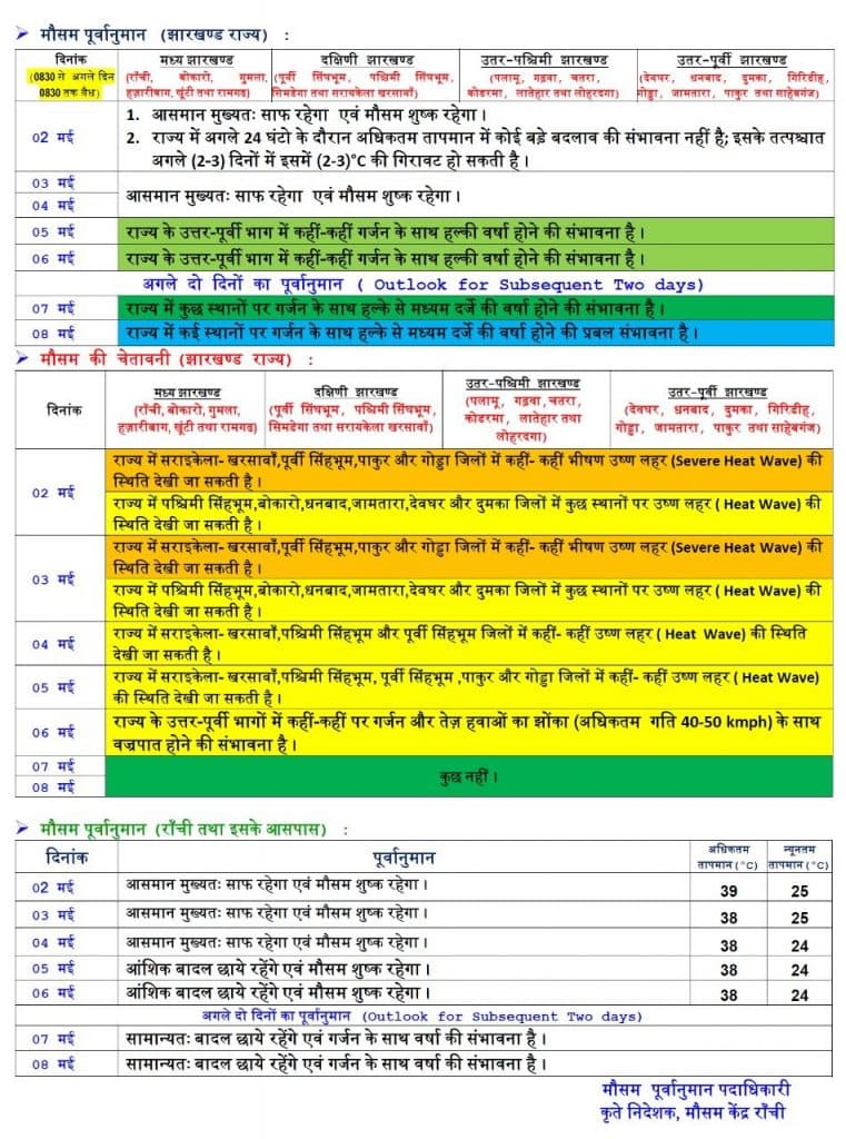 झारखंड में अधिकतम तापमान में कुछ गिरावट देखने को मिल रही है. मौसम विभाग के अनुसार, तीन और चार मई को मौसम शुष्क रहेगा. इसके बाद राज्य के कुछ हिस्सों में बारिश हो सकती है. पांच मई को प्रदेश के उत्तर-पूर्वी भाग में हल्की बारिश हो सकती है. इन इलाकों में 6 मई को भी हल्की बारिश की संभावना व्यक्त की गई है. शुक्रवार को पश्चिमी सिंहभूम, पूर्वी सिंहभूम, सरायकेला-खरसावां, बोकारो, धनबाद, देवघर, जामताड़ा के साथ-साथ दुमका, पाकुड़, गोड्डा और साहिबगंज में कहीं-कहीं हीट वेव की स्थिति नजर आ सकती है.