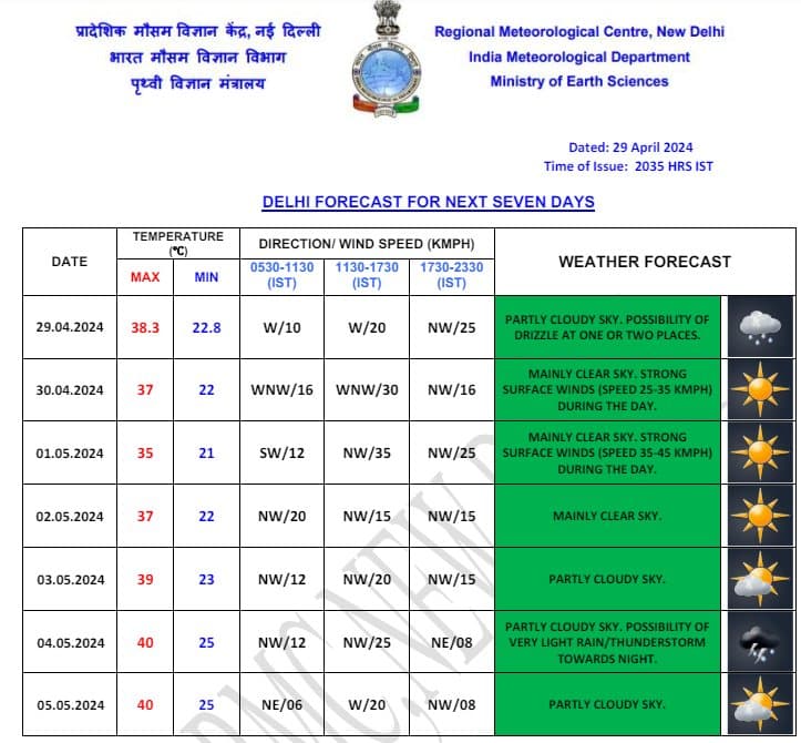Weather Forecast: दिल्ली-एनसीआर के मौसम की बात करें तो तापमान आज सोमवार से एक डिग्री कम रह सकता है. दिल्ली में अगले तीन दिनों तक मौसम साफ रहेगा. इसके बाद बादलों का आना जाना शुरू हो जाएगा. राजधानी में 4 मई को हल्की बारिश की संभावना है. मौसम विभाग के अनुसार, मंगलवार को दिल्ली का अधिकतम तापमान 37 डिग्री रिकॉर्ड किया जा सकता है. वहीं यहां का न्यूनतम तापमान 21 डिग्री रह सकता है. जानें देश के अन्य राज्यों के मौसम का हाल