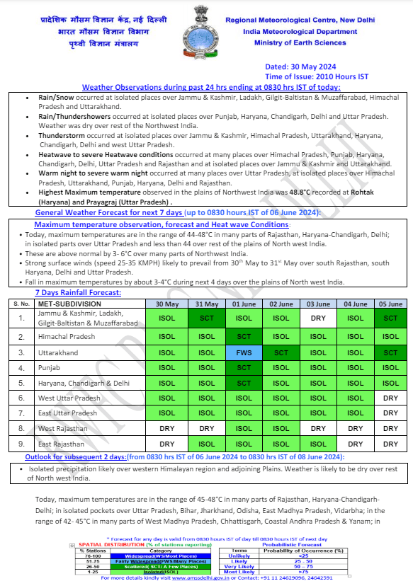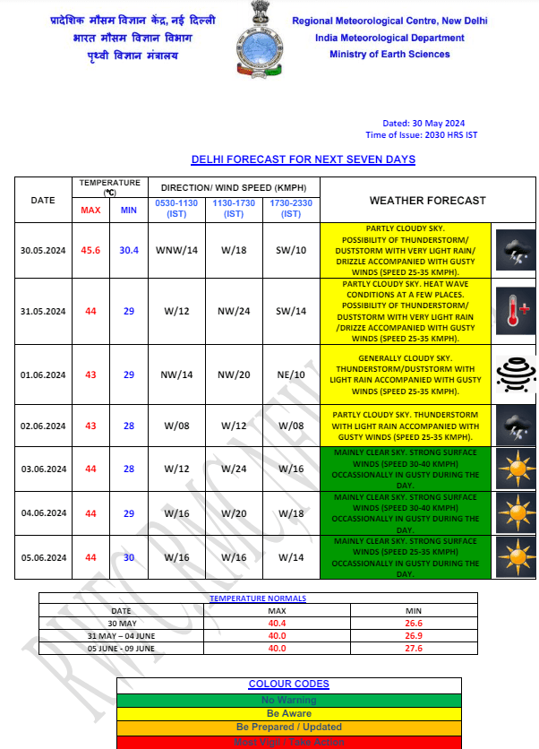 Weather Forecast : दिल्ली में गुरुवार को अधिकतम तापमान 45.6 डिग्री सेल्सियस रिकॉर्ड किया गया जो सामान्य से 5.2 डिग्री सेल्सियस ज्यादा है. मौसम विभाग के अनुसार, उत्तर भारत में आने वाले नए मौसमी बदलाव की वजह से शुक्रवार को दिल्ली में हल्की बारिश और बूंदाबांदी हो सकती है. आज दिल्ली में आंशिक रूप से बादल छाए रह सकते हैं और कुछ स्थानों पर लू चलने की संभावना विभाग की ओर से जताई गई है. राजधानी का अधिकतम और न्यूनतम तापमान क्रमश: 44 और 29 डिग्री सेल्सियस तक पहुंचने की संभावना है. राजधानी आज ‘येलो अलर्ट’ पर रहेगी. जानें देश के अन्य राज्यों के मौसम का हाल