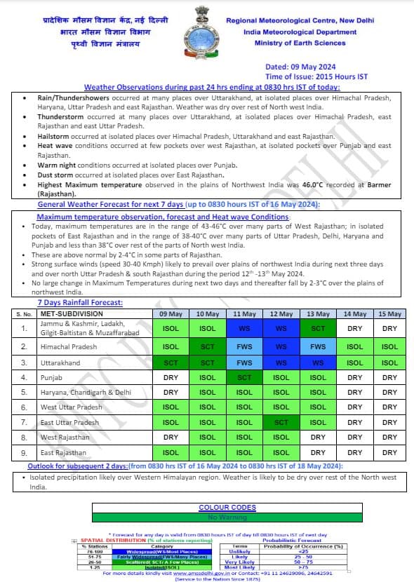 राजस्थान के अधिकतर इलाकों में भीषण गर्मी से लोग परेशान हैं. गुरुवार को फलोदी में अधिकतम तापमान 46.2 डिग्री सेल्सियस रिकॉर्ड किया गया. मौसम विभाग के अनुसार शुक्रवार को बीकानेर, जयपुर, भरतपुर संभाग में लू (हीटवेव) जारी रहने की संभावना है. 10-11 मई से एक नया पश्चिमी विक्षोभ सक्रिय हो सकता है जिससे राज्य के कुछ भागों में दोपहर बाद मेघ गर्जन के साथ आंधी चलने के साथ-साथ हल्की बारिश देखने को मिल सकती है.