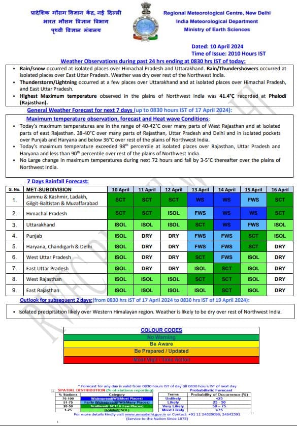 स्काइमेट वेदर के अनुसार, 11 से 12 अप्रैल के बीच जम्मू कश्मीर, हिमाचल प्रदेश के साथ-साथ उत्तराखंड में हल्की बारिश देखने को मिल सकती है. यहां कुछ इलाकों में बर्फबारी की भी संभावना है. 13 से 15 तारीख के बीच उत्तर प्रदेश, पंजाब के अलावा हरियाणा और दिल्ली में बारिश का पूर्वानुमान व्यक्त किया गया है.