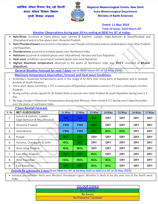 एक नए विक्षोभ के असर से राजस्थान के अनेक इलाकों में तेज आंधी व बारिश देखने को मिली. मौसम विभाग की ओर से जो जानकारी दी गई है उसके अनुसार 12-14 मई तक सूबे में आंधी बारिश की संभावना है. इससे अधिकांश भागों में अधिकतम तापमान 42 डिग्री सेल्सियस से नीचे आ सकता है.