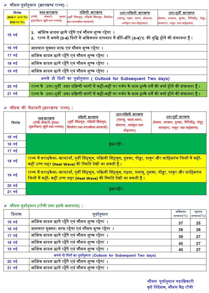 झारखंड में अब तापमान बढ़ता नजर आएगा. आज सूबे में बारिश की संभावना नहीं है. मौसम विभाग की ओर से जानकारी दी गई है कि कुछ जिलों में हीट वेव चल सकता है. आपको बता दें कि पिछले कुछ दिनो से बारिश की वजह से गर्मी से लोग राहत महसूस कर रहे थे.