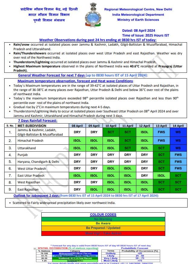 बात राजस्थान के मौसम की करें तो यहां गर्मी के जोर पकड़ने लगी है. मंगलवार से एक बार फिर सूबे के कई इलाकों में बारिश के साथ आंधी का पूर्वानुमान व्यक्त किया गया है. अगले 72 घंटे में अधिकतम तापमान में दो से तीन डिग्री सेल्सियस बढ़ोतरी हो सकती है. मौसम विभाग के अनुसार, जोधपुर, बीकानेर संभाग में कहीं-कहीं अधिकतम तापमान के 42-43 डिग्री सेल्सियस तक पहुंच सकता है जो सामान्य से कुछ ज्यादा है. विभाग के अनुसार, 13 अप्रैल से राजस्थान में एक मजबूत पश्चिमी विक्षोभ के सक्रिय होने से आंधी बारिश की गतिविधियों में बढ़ोतरी देखने को मिल सकती है जबकि अधिकतम तापमान में कुछ गिरावट आ सकती है.
