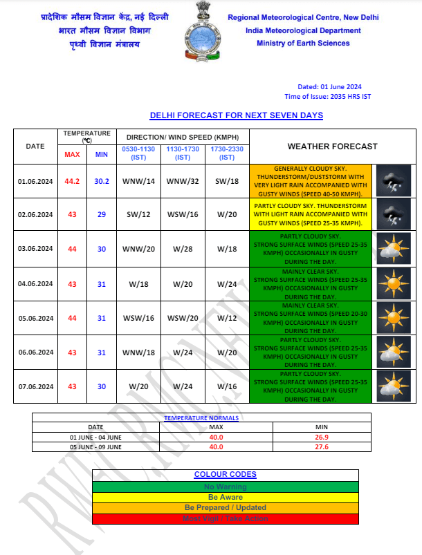 Weather Forecast : दिल्ली में शनिवार को धूल भरी आंधी चलने से लोगों को भीषण गर्मी से थोड़ी राहत मिली, हालांकि तब भी अधिकतम तापमान 44.2 डिग्री सेल्सियस रिकॉर्ड किया गया. आपको बता दें कि दिल्ली-एनसीआर में कुछ दिनों से भीषण गर्मी पड़ रही है. मौसम विभाग ने दिल्ली में रविवार को सामान्यतः बादल छाए रहने की संभावना व्यक्त की है. साथ ही हल्की बारिश होने और 25 से 35 किमी प्रति घंटे की रफ्तार से तेज हवाएं राजधानी में चल सकती है. आज राजधानी का अधिकतम और न्यूनतम तापमान क्रमश: 43 और 29 डिग्री सेल्सियस तक पहुंचने का अनुमान है. जानें देश के अन्य राज्यों के मौसम का हाल
