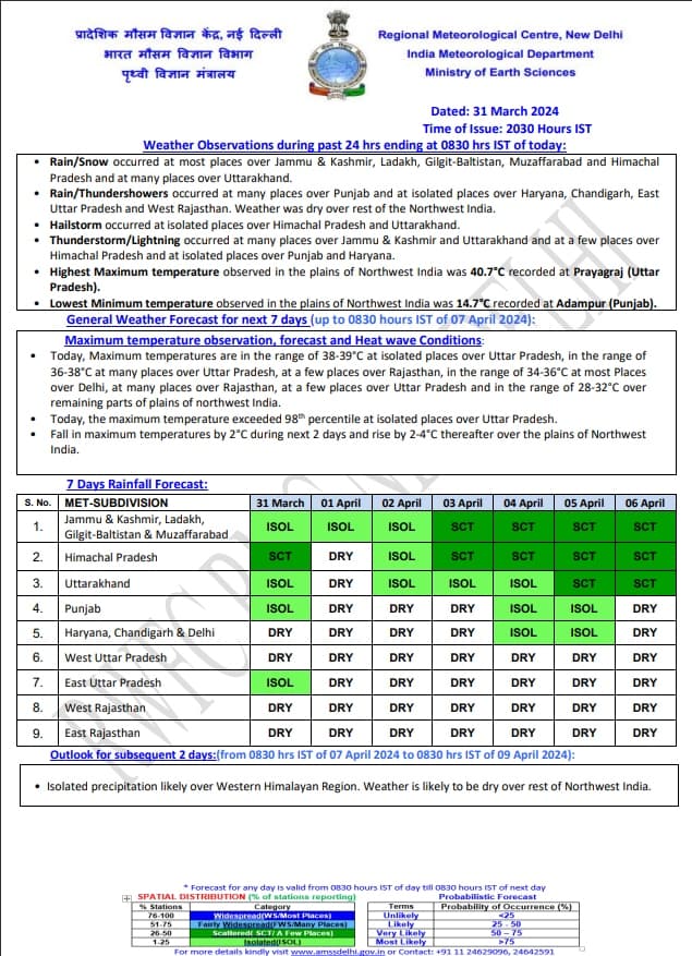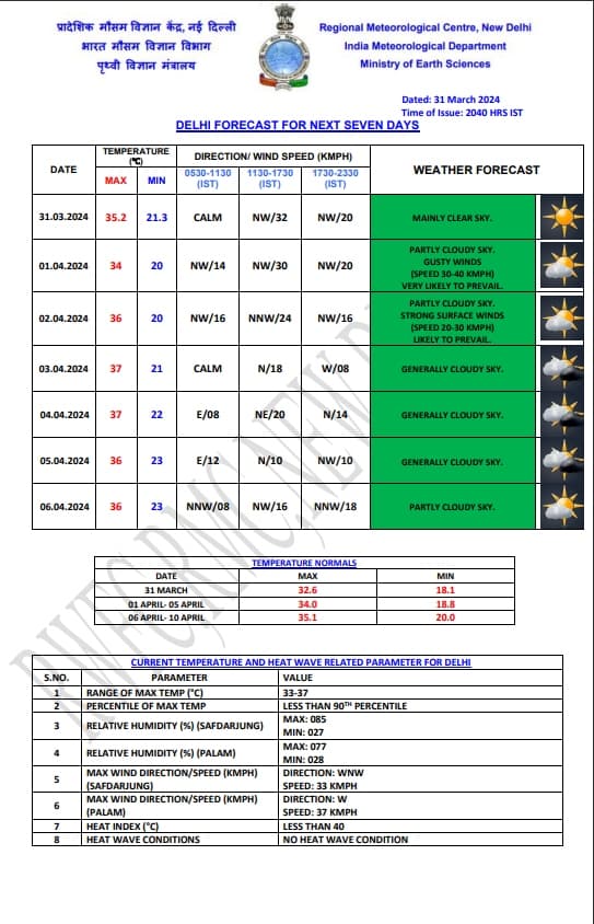 Weather Forecast: देश की राजधानी दिल्ली और एनसीआर के मौसम पर नजर डालें तो यहां सोमवार को आकाश में हल्के बादल छाए रहेंगे. साथ ही, तेज़ हवा (30 से 40 किलोमीटर प्रति घंटे की रफ्तार से) चलने का अनुमान है. राजधानी का अधिकतम और न्यूनतम तापमान क्रमश: 34 डिग्री सेल्सियस और 20 डिग्री सेल्सियस रिकॉर्ड किया जा सकता है. पांच अप्रैल तक बादलों का आना जाना लगा रहेगा. जानें देश के अन्य राज्यों के मौसम का हाल