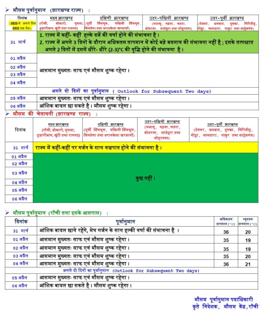 झारखंड की राजधानी रांची सहित कई जिलों में बीती रात हल्की बारिश की वजह से मौसम सुहावना हो गया है. तापमान में कुछ गिरावट दर्ज की गई है. हालांकि महीने के पहले दिन यानी आज से मौसम साफ हो जाएगा. मौसम के शुष्क रहने की वजह से तापमान में वृद्धि देखने को मिल सकती है.